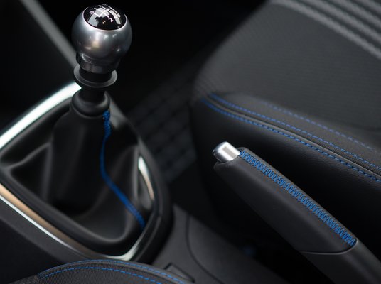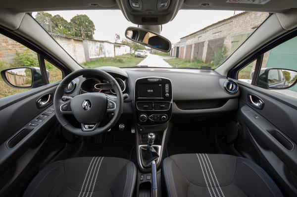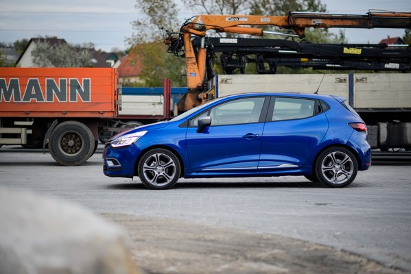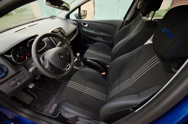 A GT line felszereltség olyasmi, mint a BMW-nél az M pakett, vagy az Audinál az S-line: jórészt optika, konkrétabban egy garnitúra 17 colos felni, egy kamu diffúzor hátul, némi szürke lökhárítóbetét elöl, meg egy gombolyag kék hímzőcérna a beltérben. Ha a GT felszereltséget kéne eladnom, nem tudom, hogyan fognék hozzá, hiszen kemény hazudozás nélkül nem sok mindent mondhatni róla. A 17-es felni egyértelműen hülyeség; az autó elbírja, de biztos, hogy jobban érezné magát nélküle. A Cliónak olyan jó a futóműve, a súlyelosztása, és ezzel az 1,2-es kisturbóval olyan könnyű is, hogy a nagy (=nehéz) sportos kerék inkább elvesz a sportosságából. A kék cérna meg... értem én, egyfajta kényszeres különbözés a számtalan piros varrású sportautó-belsőtől, de hozzáadott értéket nem látok benne. A bőrkormányon még oké, de a meztelencsiga-pelletből készült váltószoknyára teljesen feleslegesen irányítja a figyelmet.
