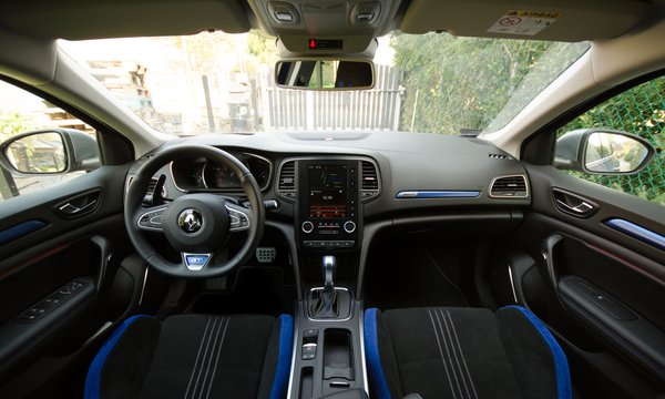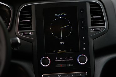 A Mégane beltere hozza a Golf színvonalát, csak kevésbé szögletesen, ami valószínűleg szándékos. A műszerfal fő attrakciója a 8,7 colos álló tablet akar lenni, amit szépen bele sikerült simítani a felületbe, guten Morgen BMW, mahlzeit Mercedes. A matt fekete keret elegáns, a gyakrabban használt virtuális gombokon viszont napok alatt kialakul egy-egy zsíros holdudvar, ami meg nem elegáns.