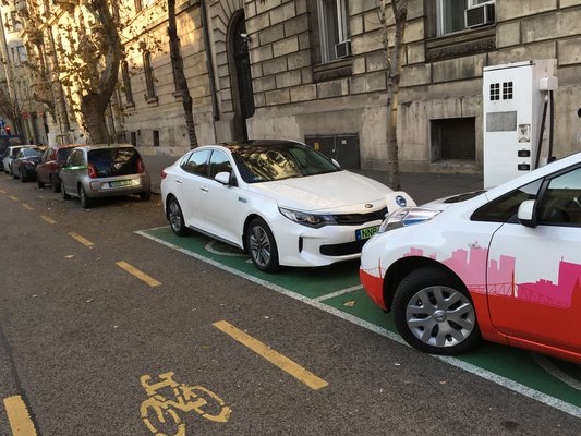 Persze, nem ígértem semmit, pár órával korábban ültem csak be a tesztautóba, ennyi idő alatt csak annyit tud meg az ember: nagy, impozáns, fehér. Mivel ez egy Plug-in Hybrid Vehicle (PHEV), azaz Konnektoros Hibrid Jármű (KHiJA?), az akkumulátorai pedig szinte tök üresek voltak, első utam a töltőhöz vezetett. Az elektromos Soulnál megszoktam, hogy az orrába kell dugni a kábelt, de itt hiába is kerestem a hűtőrács helyén a csatlakozót, a fedél a kocsi bal első sárvédőjében van. Ez okozott kis fennforgást, mert a töltőnél már állt egy Leaf, így viszont a kábel már nem ért el az Optima bal elejéig. Kénytelen voltam a más villanyautósoktól ellesett trükköt alkalmazni: szabálytalanul, a forgalommal szembe kellett parkolnom. (Ez természetesen fikció, sosem tennék ilyent, az illusztráció képmanipuláló szoftver segítségével készült.)