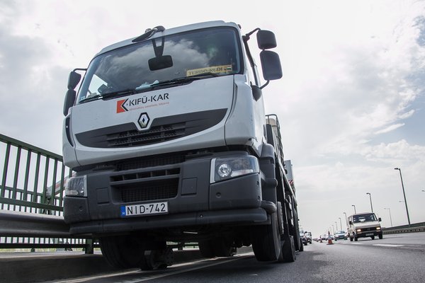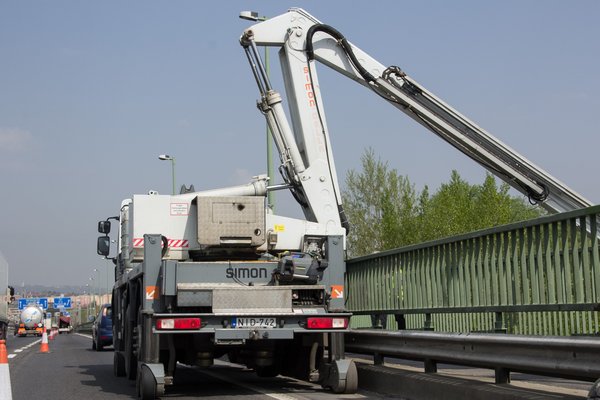 Ez itt nem a reklám helye: a Magyar Közút Zrt. megbízásából dolgozó kápolnásnyéki cég a gyakorlott szakembergárdájával, korszerű technológiájával és célgépeivel szinte egyedülálló az országban, említése tehát, konkurencia hiányában, nem hozza versenyelőnybe. Mint a minket felkaroló Pásztor Zoltán ügyvezetőtől elöljáróban megtudtam, a szóban forgó gép nem hídmosó-, hanem elsődleges rendeltetése szerint hídvizsgáló berendezés, de most éppen mosásra használják. Több más gépük is van, például olyan, amely nem kétszemélyes munkakosárral, hanem hosszabb munkapaddal van felszerelve, és komolyabb karbantartási munkákat is lehetővé tesz.