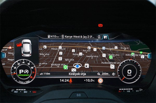 A multimédiás rendszert is alaposan átgondolták, és onnantól, hogy elhagyták a hagyományos műszerfalat, és a kormány mögé is egy hatalmas kijelzőt építettek, új távlatok nyíltak. Tetszés szerint tologathatjuk, melyik kijelzőn mit szeretnénk látni, nekem az jött be a leginkább, amikor a kormány mögött a térképet néztem, kicsinyített órákkal, míg a középső kijelzőn a zenéim vagy a telefonos kontaktjaimat értem el. A legszebb, hogy ez nem hosszas állítgatás kérdése, hanem külön gombokkal váltogatható, így minden esetben az éppen kellő képernyőkhöz férünk hozzá.