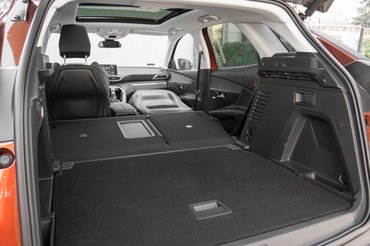 Hogy mekkora a belseje? Pont akkora, amire azt mondja az ember, ideális családi autó, nem csak anyuci szaladgálós kocsija. Még a napfénytetős verzióban is van elég hely a fejnek, a hátsó, sík padló miatt az ötödik utas élete sem pokol. A 3008 csomagtartója 520 literes, ez egy jófajta kombi értéke, más kérdés, hogy egy 28-as bringa úgy fér be, ha kiveszik az első kerekét, mert a SUV inkább magas, mint hosszú. A 3008-as is megkapta a csomagtérnyitás szent grálját, az alárugdosós nyitást, mivel feláras, én egy fillért nem adnék ezért, de döntse el mindenki maga. A villanyos nyitású ajtó a kulcsról, meg a műszerfalról is távvezérelhető, szerintem ez bőven elég. A Peugeot viszont ügyesen az utasülés támláját is előredönthetőnek csinálta, így a csomagtartóba igazán hosszú dolgok is betuszkolhatók nulla utasos üzemmódban.