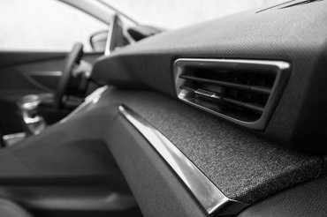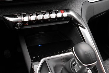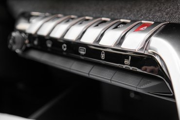 Magát a szerelvényfalat kétszintesre csinálták, és a két szint közötti hasadékba jutott egy kis szövetminta is – kicsit vidámabb lenne az összhatás, ha az anyag nem az idős nénik kösztümjeit idézné, kicsit túl szürke ez ide. A Peugeot fémhatású fémeket használ még dísznek, a zongorabillentyű-jellegű kapcsolók, a díszcsíkok mind valódiak, és ez igazán klassz.