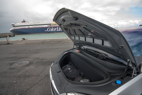 De mivel Teslából van, alig foglal benne helyet a technika, tehát kellőképpen tágas is. Elöl van ugye, a két bazi fotel (mondjuk az ülőlap egy hangyányit rövid volt nekem), a második sor űrfilmes székei is tágasak, leghátra pedig – mondjuk épp be lehet férni. Nem rossz, hiszen még három sor működő üléssel is van némi csomagtartó hátul, no meg a kocsi elejében is akad rekesz.