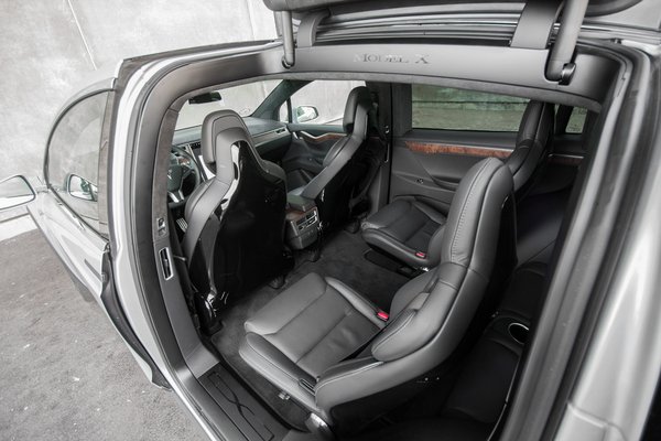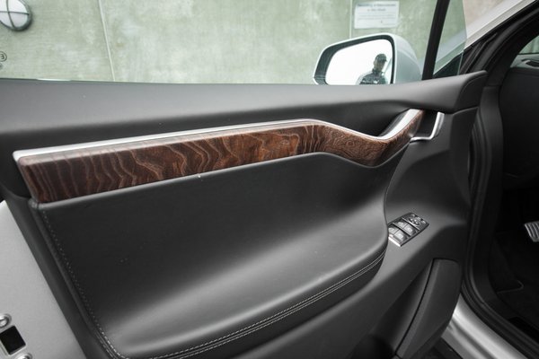 Hogy élőben milyen? Gyanús. Sokkal gyanúsabb, mint például a Model S volt, amikor először beleültünk – akkor az volt a benyomásunk, hogy nini, ez itt egy kész autó, s tényleg csak nyomokban venni rajta észre, hogy egy semmiből kinőtt autógyártóról van szó mögötte. Ez a Mode X viszont kicsit olyan, mintha egy hatalmas, OSB-lapokból összeszögelt, de ügyesen kitalált házi kreációban csücsülnénk, amit profi lakberendezők bőrrel, fával, zajcsillapító-anyagokkal tettek volna otthonossá. Mondjuk, ez az inkriminált „otthonos” szó talán nem a legalkalmasabb arra, hogy leírja a Model X fenyegetően fekete, rideg belső terét, de tény, ami benne van, az igényes – a műanyagok finomak, a bőrök bőrök, a fabetétek pedig olyan valódiak, hogy jó szívvel nem is hagynám kint ezt az autót olyan helyen, ahol az orrom azt regisztrálja, fával tüzelnek. Még a végén valami vaskályhában landol az egész díszítés.
