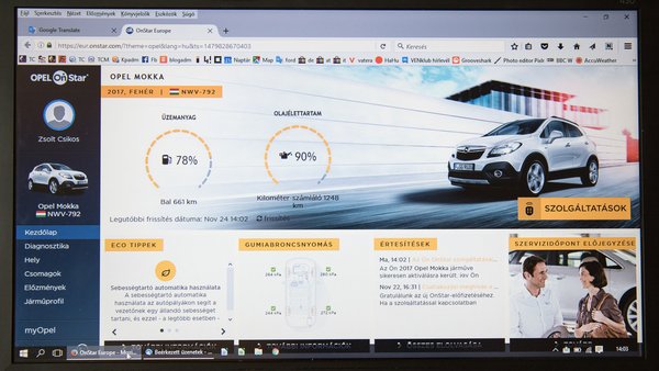 Hogy feltegyem az i-re a pontot, kipróbáltam az új Mokka-tulajoknak most egy évre ingyen adott OnStar szolgáltatást (bizonyos mélységig). Az OnStar az Opel ingyenes, autóból működő vészsegély/tudakozó/információs/internetszolgáltató rendszere, a maga módján egyedi az autós világban. Már láttam működni olyat, amit profi módon hozzálőttek a tulaj mobiltelefonjához (ehhez van app a neten, sajnos egyelőre német forrásból kell letölteni, de magyarul beszél), igazán kényelmes cucc, csomóan szerintem le is szoknak miatta arról, hogy otthon megtervezzék az aznapi útvonalukat. Mindenesetre vicces volt a fogyasztási adataimat látni a Cubot X17 kijelzőjén, kicsit beleturkáltam az autó paraméterezésébe is (az irodai székemben ülve, a Flórián téren). Ez azonban még nem veszi meg nekem a Mokkát – talán a nővérem imádná az OnStart, mert ő rettenetesen szétszórt mindig, és azt se tudja, hol van. Majd beajánlom neki, hátha lesz egy jobb találata a lottón.