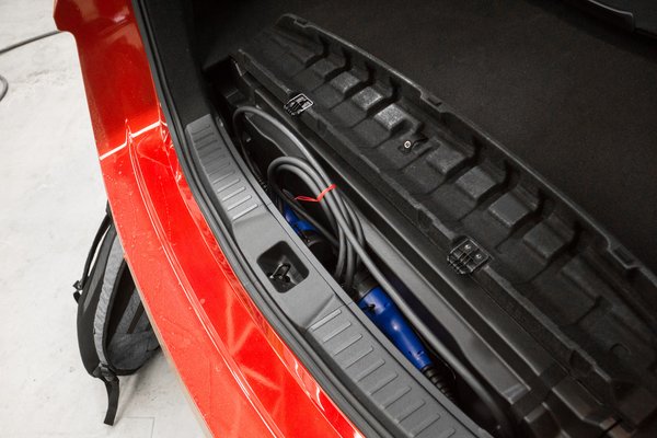 Amint leadtuk a kocsit, töltőre rakták a következő turnusnak. 3,3 kW a legnagyobb töltési teljesítmény, 65%-os töltöttség akár két óra alatt is elérhető, ha az ember Type II-es Mennekes töltőt használ, hagyományos, házi csatlakozóval 3 óra 10 perc, míg elég delejt magába szív. A csatlakozó mellett egy vakdugó is van, ez majd a csak japánban elérhető gyorstöltőnek készíti elő a helyet.