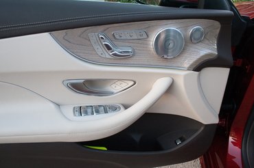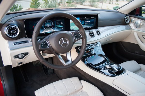 Az utastér is az alap E-osztály öröksége, de a kupévá alakítás során sokat finomítottak rajta. A műszerfal hullámos fabetétje elegánsan fordul rá a nagy ajtókra, a hosszú felületet kör alakú, turbinákat idéző szellőzőrostélyok szakítják meg. A modern Mercedesek dupla iPadre hajazó, egybefüggő műszeregysége gyönyörűen illik a designba. Elsőre talán kicsi sok a díszítés, de a jó ízléssel összeválogatott színek, formák és anyagok egyedi hangulatához hamar hozzászokik az ember.