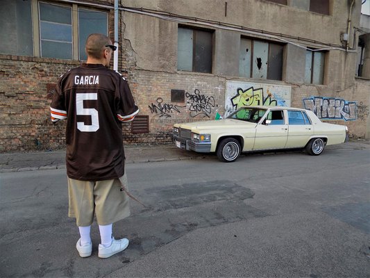 Ami viszont ennél is jobban lenyűgöz, az a tulaj és autó közös jelensége. Itt nem arról van szó, hogy az autó formálta saját képére az embert, Gábor már az autó megvétele előtt Garcia lett, és előbb kezdett el Cypress Hill-t hallgatni fülhallgatóval, minthogy megtehette volna azt az autó csomagtartójába épített hangrendszerrel. Régóta oda van a mexikói életstílusért, ezért is érezte úgy, hogy kell neki ez az autó, egyfajta kiegészítő ez, ahogyan az ütő a csomagtartóban, a zászló a sárvédőn, és a zacsiig húzott fehér zokni is. Most épp nem működik a dallamkürt, ami a La Cucaracha-t játszaná, máskülönben az is biztos párszor már felharsant volna. Így érzi jól magát, látszik, hogy irigylésre méltó módon boldog a bőrében, nála van jó helyen a kocsi. Pardon, Lolita. Aki egyébként ősmagyar amerikai autó, immár ősmagyar Chicano tulajdonossal, akitől csak a benzinnek van félnivalója. Csodálatos páros, ez a zsigerből jövő koprodukció tényleg hibátlan jelenség.