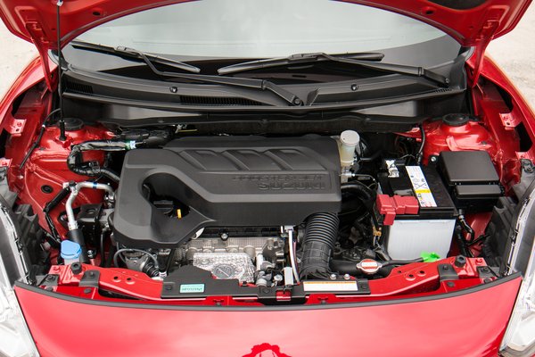 A menetpróbán a Swift kínálat csúcsát tették le elénk, ami azt jelenti, hogy a GLX szint, az új Boosterjet háromhengeres turbómotorral, enyhén hibridizált kivitelben. Ez azt jelenti, hogy egy szíjhajtású motor/generátor segít rá, ha szükséges, motorfékezéskor, lejtmenetkor pedig eltárol valamennyi energiát egy külön 12 voltos lítium akksiban. Ettől a motor teljesítménye és nyomatéka nem javul (111 LE, 170 Nm), mivel amit az elektromos rész hozzátesz, azt elveszik a benzines oldalról.