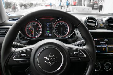 Igazából a Swift belseje a kulcs. Minden tiszteletem a Suzukié, hogy bármelyik gyárában tudja reprodukálni ugyanazt a Suzuki-szagot: nem rossz, nem jó, de jellegzetes. Hát ez is ilyen, viszont suzukis mércével formai orgia fogadja az embert. A lapított aljú kormány és a dupla csőműszer kifejezetten sportos, és nem véletlenül: a bemutatón a swiftizmus alaptétele volt a sportosság, minden második mondat erről szólt. Jót tesz a sok fekete közt a fehér díszléc, a kerek formák (légbeömlők, műszerek, klímapanel) jól rímelnek. Az első ülések oldaltartását megnövelték, ez már ránézésre is látszik, bár a menetpróba alapján inkább kényelmesnek tűnt, mint veszettül sportosnak.