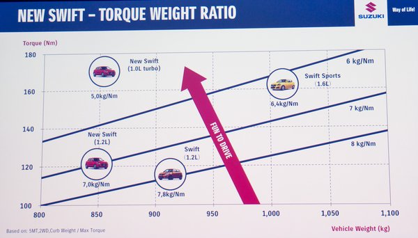 Ami a jövőt illeti, lehet tudni, hogy a Swiftből is készül majd összkerékhajtásos kivitel, és bár az Allgrip nevet a Vitaránál/S-Crossnál elektronikus tengelykapcsolós rendszerre használlják, a Swift Allgripje sima viszkokuplungot használ majd. És igen, lesz Swift Sport is, de nagy volt a titkolózás vele kapcsolatban, mindenesetre nem kizárt, hogy még Frankfurt előtt bemutatják. A Swift prezentációjában volt egy érdekes árba, amely a nyomaték/autótömeg viszonyokat mutatta – a kis ezres motorral az új Swift ott jár, ahol a régi az egyhatos szívómotorral. Szóval itt valami nagyobb dobás várható, és ha fogadni kéne, a Vitarában használt, zseniális 1,4-es turbómotorra tippelnék. Ha ez bejön, nagyot fog szólni.