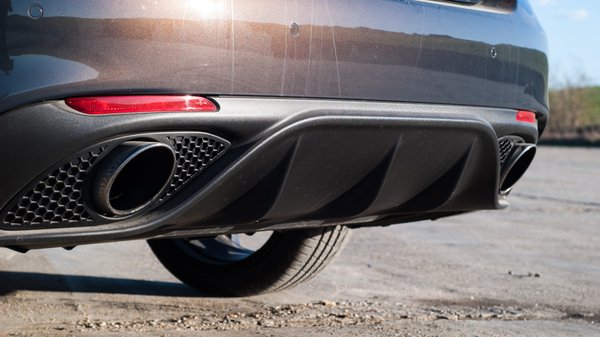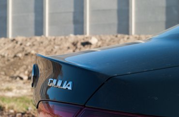 Elölről morcos, kissé dagi fejű macska, hátulról meg semmi másra sem emlékszem, csak arra a bámulatra, amikor megfigyeltem, hogyan lesz a sárvédő lankás izompúpjából egyszerre csak a farokszpoiler pengevékony kilépőéle, mintha ez a világ legnyilvánvalóbb átmenete volna. Nagyon szép autó. Nagyon szép autó, de nem korszakos műremek, nem tanítani való referencia, mint a 159. Ez az egyik legszebb prémium középszedán, de nem a legszebb Alfa. Pláne, ha beleszámítom, hogy a platform miatt micsoda orbitális előnnyel indul minden elsőkerekes elődjéhez képest. Jó, ha telibe rásüt a nap, és a fura, szürkés-kékes, delfinszerű fényezésben kezd izzani a belefújt aranyszín gyöngyház, hogy szinte kiugrik a forma, olyankor nehéz máshova nézni.
