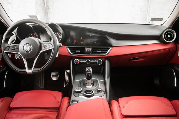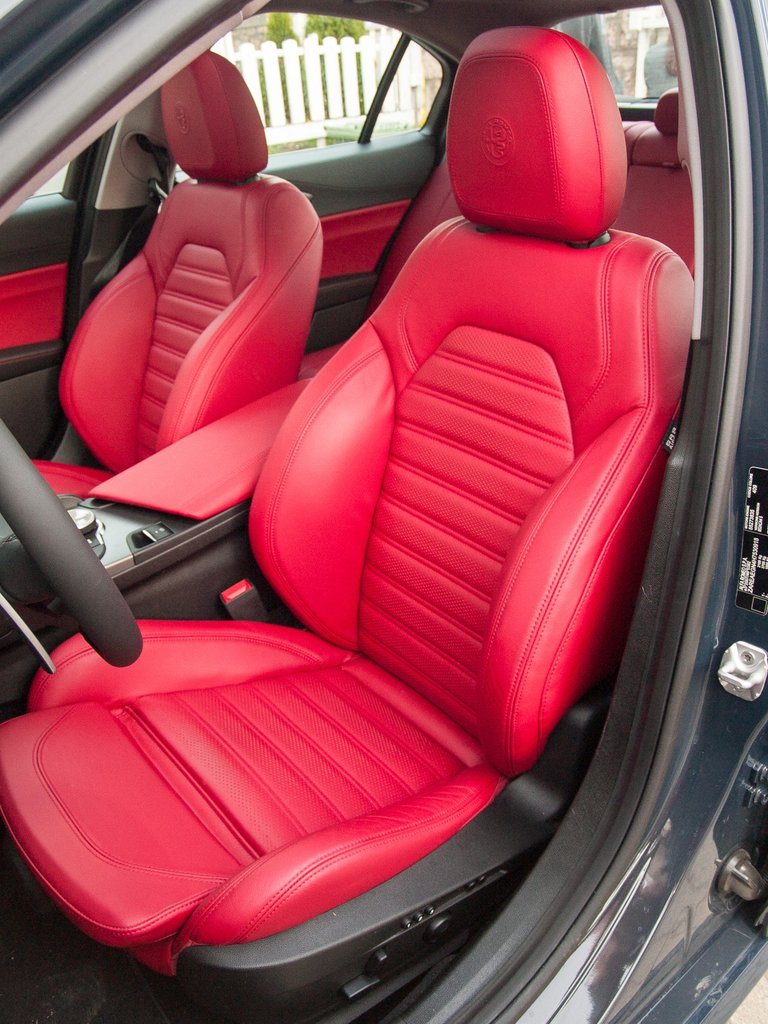 És akkor belül meg ott az a vörös bőr! Az Alfa nagyon érzi ezt a hurkás, dísznyomatos bőrbelsőt, az ülések gyönyörűek. Ahogy csodaszép a műszerfal íve is, és az egész kormány. És a sötétített panel mögé eldugott központi képernyő, azért vajon kit ölelhetek meg? Olyan finom, olyan elegáns megoldás, olyan varázslatos, hogy kikapcsolja az ember, és nyomtalanul eltűnik, mintha soha nem is lett volna ott semmi. Ehhez mérten a még mindig legelterjedtebbnek számító odagányolt tablet (rád nézek, Mercedes, Audi és BMW) tragikomikus.