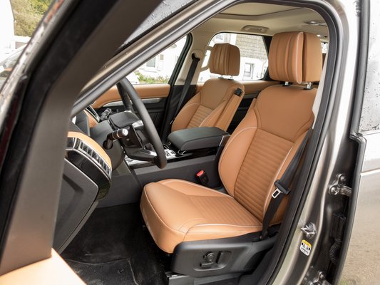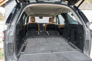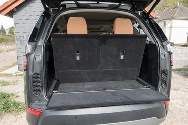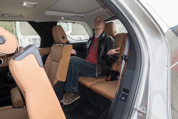 A kocsi maga kicsit hosszabb (már majdnem öt méteres), szélesebb és alacsonyabb lett, de nem jelentősek a változások, csak a 3,8 centiméternyi tengelytáv-gyarapodás az, amit érdemes a kilók elvesztésén túl megjegyeznünk. Igazi hétüléses – hirdeti a Land Rover -, utalva arra, hogy még a legbehemótabb hasonló nagy-SUV is csak szükséghelyeket tud felkínálni a leghátsó sorban, míg ez az autó a második sorban 954, de még a harmadikban is 867 milliméteres lábteret kínál. Kipróbáltam, tényleg mindenütt el lehet férni; ha a középső sor nem a leghátsó helyzetében van a sínen, akkor hátul sem nyomja szét a térdem a támla, s a fejem is elfér. Egy probléma maradt csupán – hogy a leghátsó sorból is előre lehessen látni legalább kicsit, a középső sor ülőlapját a kellemesnél alacsonyabbra tették. Nekem kicsit túl alacsonyra is, hiszen ott eléggé magzati pózban ülök – hosszú távra lehet, hogy inkább leghátulra ülnék.