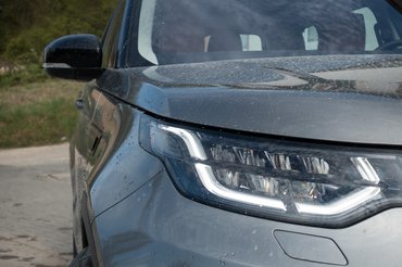 Szerencsére megtartották a discovery-s külsőt, a meredek szélvédőt, a tömbszerű orrot a kis túlnyúlással, a vastag (nekem kicsit már komikusan súlyos) C oszlopot, a lépcsőt a tetőben (hogy legyen leghátul is fejtér) is, miközben a belső tér kidolgozása ismét szintet lépett. Azért még messze nem Range Rover, hiszen a műszerfal teteje fényes (bár puha), az első üléseket elég hosszan kell állítgatni ahhoz, hogy igazán kényelmesek legyenek (és félek, hogy nagyon hosszú távon még úgy sem azok). Itt-ott a díszek is viccesek (kedvencem a találékony mintázattal ellátott alubetét, ami olyan, mint amikor a napon az átlátszó fólia ráég a fémre, majd megrepedezik), de ezek mellékes szempontok.