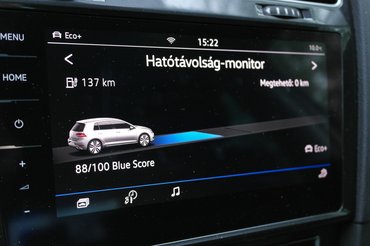 Ehhez persze érdemes volt 'B' állásba kapcsolni a váltót, amivel kis odafigyeléssel el is felejthetjük a fékpedált, hiszen a gyorsítópedál 0-s állásában elég komoly motorféket kapunk (mint a BMW i3-asnál). Ekkor természetesen hatótáv-kilométereket is nyerhetünk, hiszen az autó visszatáplál. Így szinte kényszerít az e-Golf a minél gazdaságosabb vezetésre. A spúrságot az Eco+ móddal lehet tovább fokozni, amikor a 390 newtonméterből csak 211 marad, az elméleti végsebesség 150-160 km/h-ról 90-re csökken, és búcsút inthetünk a klímának. A pedálút viszont csak érzetre rövidül, kicsit erősebben taposva újra padlóig nyomhatjuk a gyorsítópedált, így ismét kihasználhatjuk a teljes potenciált, ami előzéskor nem is árt.