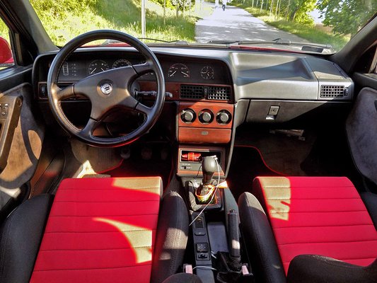 A gazdi és ez a bárki behuppantak az ülésekbe, de nem az enyémekbe. Egy második generációs Lancia Delta HPE-ből valók, teljesen fel vannak újítva az egész beltérrel együtt, és ha Lóránt ül benne, akkor ki kell nyitni a tetőablakot, különben úgy járna, mint Dino a Gli antenatiből. Hamarosan meg lesz oldva valahogy a jövőben, hogy lejjebb kerülhessenek, a gyári ülések magasságába, mindent az oldaltartásért. A műszerfal látványától elismerőek a csettintések, szerintem fontos, hogy minél több legyen a visszajelzés. Most épp nem is mutatnak hülyeségeket, pedig legendásakat tudok morzézni a kis lámpákkal, ha bedurcizok.