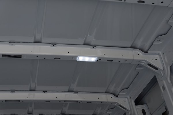 A dobozban négy ledes lámpacsoportot is találunk, de nem sikerült eltalálni a színhőmérsékletet, így én ha gyakran kellene éjjel rakodnom, kicserélném valami szembarátabbra. Ráadásul a fényerejük se túl izmos. A raktérben amúgy számtalan luk várja a felépítménygyártókat, hogy belemezelhessék, bepolcozhassák a dobozt. És, bár a bemutató darabok mindegyikében be volt falazva a sofőr feletti rész, kérhető oda is tárolóhely.