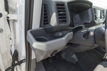 Pohár- és italtartóba sincs hiány, régi szokás szerint a középső ülés háttámlája is szolgálhat lehajtva asztalkaként. Az egyetlen, amit nem teljesen értek, és már a Citroën Jumpynál se értettem, miért rakják némelyik pohártartót gyakorlatilag a szélvédő alá. Egyfelől kicsit olyan, mintha a marketingesek kitalálták volna, kell a kocsiba minimum 6 pohártartó, és a mérnökök a végén csak ott találtak neki helyet. Másfelől, hacsak nem kávét teszünk oda, a szélvédő alatt csodálatosan felmelegszik, plusz alig érjük el. Szerencsére azért kézközelben is akad helye a palackunknak, poharunknak.