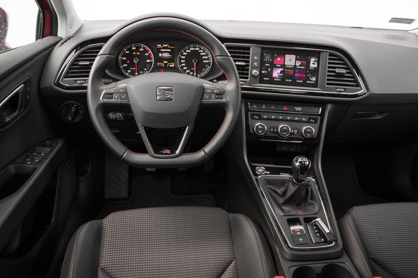 A Seat Leon eleve a harsányabb színekkel és vagányabb formákkal feltűnősködő testvér a VW-konszern kompakt MQB-típuscsaládjában, az Audi A3, a VW Golf és a Skoda Octavia mellett. Az aktuális modellfrissítést követően ez még inkább igaz; új, krómkeretes a hűtőmaszk, átrajzolták a lámpákat és persze újak a lökhárítók. Elölről pont a sportosabb lökhárító, hátulról a dupla csövű kipufogóvég mutatja, hogy ez a Leon egy FR, de a Cuprával azért nem keverjük majd össze.
