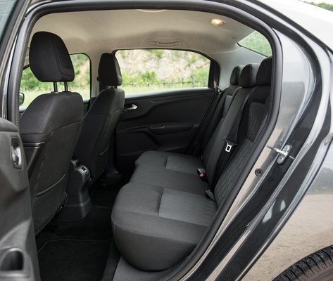 A formája tehát nem lepett meg. Sokkal inkább, hogy kicsi. Vagyis széltében nem nagyobbak voltak ezek a török szedánok? Hát nem feltétlenül. A Renault Fluence, nyugodjék békében, tényleg nagy volt, a C-Elysée viszont inkább a Thalia-iskola; megnyújtott kisautó. Beültem, és pár másodpercig a jobb karomat nézegettem: ezen a könyöklőn bizony lesznek harcok, mint egy moziszék karfáján, vagy repülős turistaosztályon. Na jó, hát ezen lendüljünk is túl, az ülés például teljesen rendben van, még deréktámasz nélkül is. Hátul kicsit talán jobb, mert nincs a két ülés között egy váltó meg egy kézifék, csak a harmadik ülés.