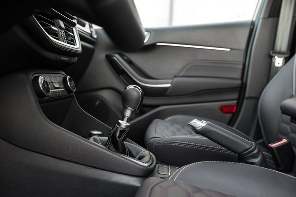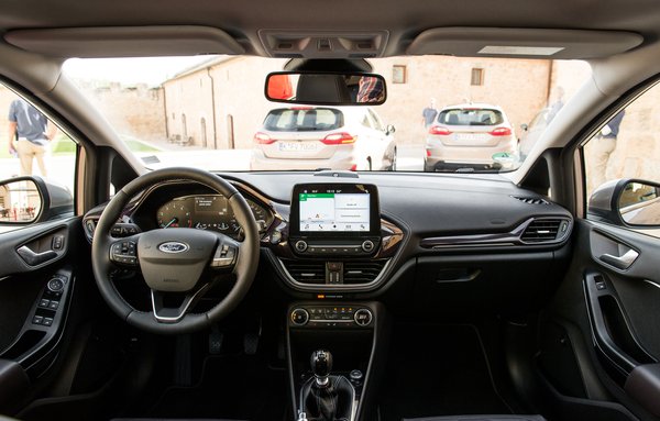 Belül a tablet adja az első sokkot (4,2 és 6,4 illetve 8 colos méretben). A műszerfal gombjainak felét egyből megspórolták, de nem kell nagy ész, hogy ez csak a gyártónak jó, nem a vásárlónak, aki eztán egyetlen gombnyomás helyett szerencsétlenkedhet a menüben. A belsőépítészet kicsit eltér a szokásos Ford-filozófiától, mely szerint a részlegfőnök előző életében kukac volt, ezért számára az a megnyugtató, ha nincsenek körülötte nagy terek, és minden irányban körülveszi az alma. A Fiestában nem türemkedik mindenhonnan ránk az autó. A középkonzol kicsit tolakodón adja a jobb lábszáram tudtára, hogy szerintük ez továbbra is kisautó, amúgy szerintem a Fiesta az egyik legszellősebb Ford.
