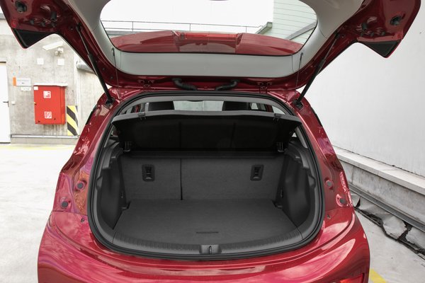 És kellemes is. Ez itt egy rendkívül jól használható, barátságos autó. Először is tágas, mint a Moszkva tér hétfő hajnali háromkor – és nem az első ülések helykínálata a meglepő, hanem a bulizóna, ami hátul van. Ez nem kompaktautó-térkínálat, itt valami magasabb rendű centiosztás történt. Hinné az ember, hogy a Media Markt-raktárnyi akku és a barlangnyi utastér után nem sok jóra lehet készülni csomagtartó-vonalon, de az Ampera-e itt is rácáfol a megérzéseinkre: elsőre ugyan tényleg laposnak látszik a raktér, de egy mozdulattal kijön belőle (vagy alsó helyzetébe csusszantható) a merev padló, és máris tisztességes a hely – 381 liter alapból, 1274 leborogatva. De ahhoz, hogy átalakítás után sík felületet kapjunk, a padlót a felső helyzetben kell rögzíteni.