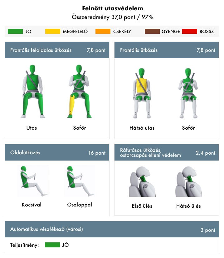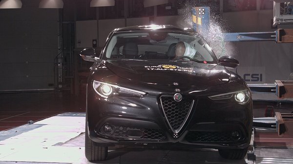 A teszt alanya, a 2,2 literes dízel Stelvio mindkét (40%-os és a teljes átfedéses) frontális ütközés esetében jól védi a kritikus testrészeket. Különböző méretű embereknél, különböző üléspozíciókban a lábszár, térd és comb számára is megfelelő védelmet nyújt. A hátsó utas esetében mellkasnál vesztett pontszámokat az autó, de nincs ok aggodalomra, még így is megfelelő besorolás kapott. Nyaksérülés elleni védelemben is jeleskedik a Stelvio, bármelyik ülésben ér minket baleset, az ostorcsapástól nem kell félnünk.