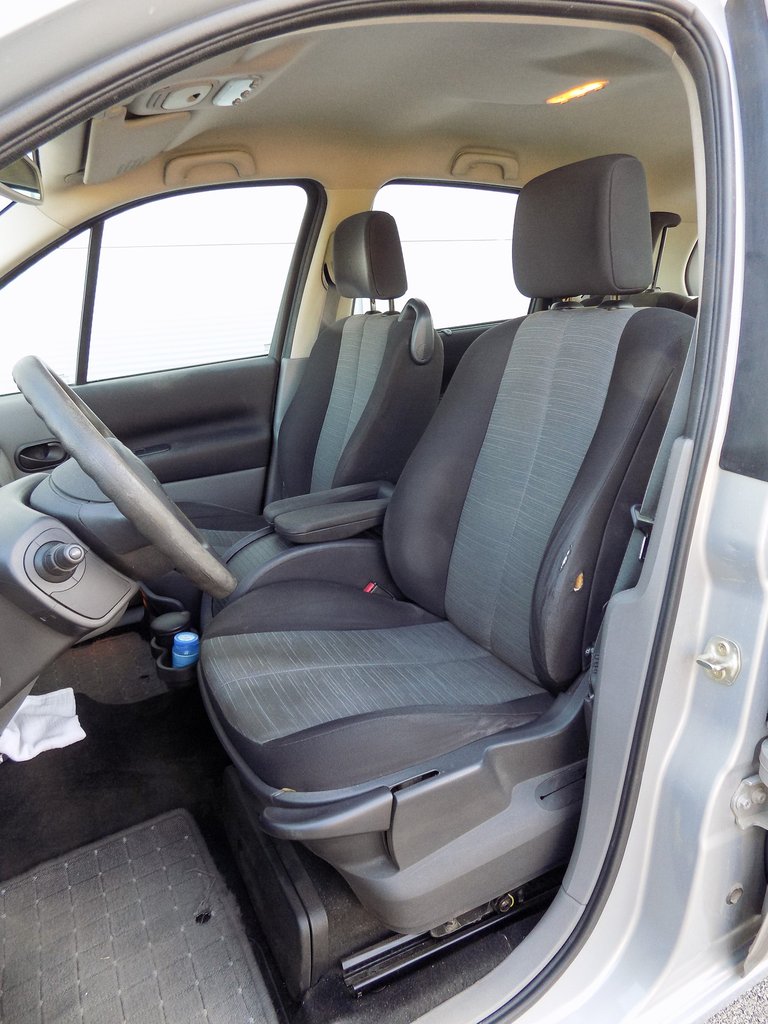 Elöl szinte ugyanakkora ülések vannak, mint hátul, azaz az ülőlapjuk kicsit rövid, a támlájuk pedig keskeny, testépítőknek bajosan volna elegendő, de átlagembernek megfelel. A vezetőülés minden irányban állítható, elég tág tartományok közt. Sokat elmond, hogy faterom minden autóban maxra húzza az ülést felfelé, én pedig ugyanezt teszem lefelé és mégis mindkettőnket ki tud szolgálni. A kilométerek már elkezdték megenni az első üléseket, de a felújítás még várat magára.