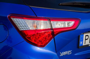 A formáját mondjuk nem sorolnám ide, még akkor sem, ha erre a legújabb változatra jobb ránézni, mint a kifutó, krómbajszos széria példányaira. A változás szemből igazán feltűnő: bár megmaradt a tátott szájú bulldog-arc, a nagy fekete hűtőrács-imitációt szűkebbre szabták, így kevésbé tűnik indokolatlanul agresszívnek. Profilból nem változott semmit a Yaris, a meredek övvonal és a tető íve még ma sem hat divatjamúltnak, bár nem is különösebben érdekes. Abban viszont nem vagyok biztos, hogy a hátsó lámpák behúzása az ötödik ajtóba tényleg jó ötlet volt. Ezektől hátulról még keskenyebbnek hat az autó, mint amilyen a valóságban. A Selection felszereltséghez tartozó kétszínű, kék-fekete fényezés – a gyári prospektus szerint vízkék – viszont sokat dob az összképen, talán ez lehetett az oka, hogy a tesztautót sokan megbámulták az utcán.