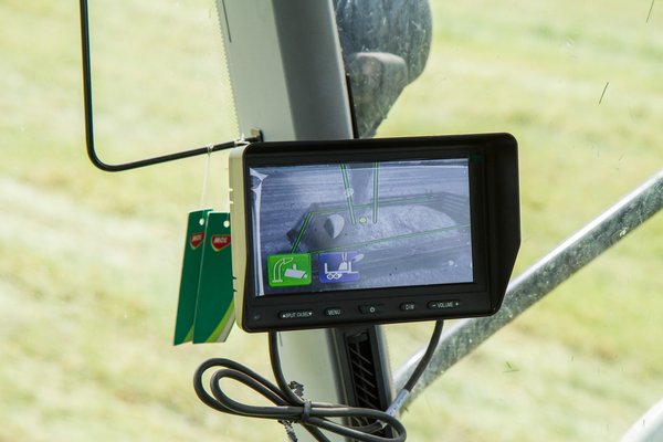 Van viszont itt még egy érdekesség, az Opti-Fill névre keresztelt, úgynevezett automatikus oszlopvezérlés. Oszlopnak hívják ugye azt a csövet, amin a szecska távozik, ezt a gép képes automatikusan kezelni. Van rajta ugyanis egy kamera, amelynek segítségével egyenletesen osztja el az anyagot a pótoson. Ha valahol már túl magasra nő domb, a képfelismerő rendszer kicsit fordít az oszlopon és a pótkocsi más részére szór. Ezzel még teljesen fogalmatlan újságírók is képesek szépen megrakni a traktorok pótkocsijait, de Csabi azt is elárulja, hogy szerinte nincs az a németesen szépen megrakott pótos, amire ne lehetne még egy jó adagot rápakolni. Ezért amikor a kamerás rendszer kiadja a megtelt jelzést, szépen végigmegyek még egyszer az egész pótkocsin, hogy az utolsó kis zugba is jusson a szecskából, aztán elköszönünk a traktortól, és jön a következő. Az oszlop forgatása sem kunszt, sőt, erre is van automatika: 225 fokot képes elfordulni.