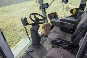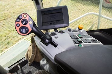 Bár a hasonló gépek is teljesen GPS-vezérelhetőek, azaz mondjuk a hatalmas kukoricaföldön jól elboldogulna a Jaguar minden kormányzás nélkül, itt Csabi igazából még a sebességtartót sem használja. Egyszerűen szereti kezelni a gépet, amúgy is minden elintézhető a Linde-karral, azaz a jobb oldali, hatalmas könyöklőn-kezelőpolton lévő joystick-kal: a felszedő emelgetése, a torony átfordítása, lassítás-gyorsítás.