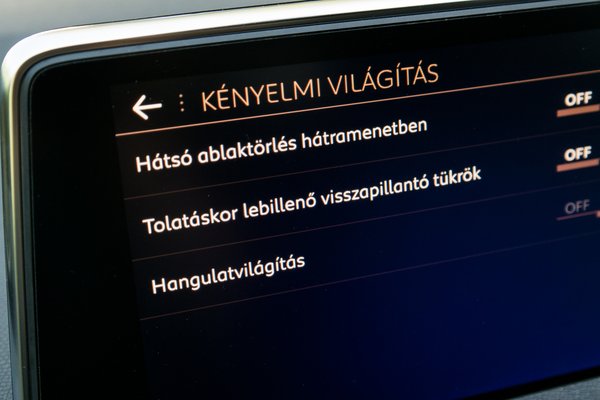 Lehet, hogy majd egy szoftverfrissítés mindent megold, de maga a rendszer kusza, mindent ezer helyről kell összevadászni, és ha már egy funkciót nagy nehezen megtalál az ember, akkor is nehezen leli meg újra. Végigfotóztam a műszerfal fényerejének a szabályzását (ha már nem sikerült fényérzékelőt beépíteni hozzá). Alig hat lépésből megvan, amit más autóban egyetlen tekerőgombbal megoldottak. A „hangulat” (illatosító+kijelző színek, jelzőhangok) változtatásának viszont jutott külön fizikai gomb – érdekes tervezői szempontok ezek.