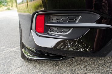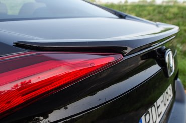 Ez meg itt egész koherens, pedig van egy erős hendikepje: hogy hozzánk későn ért. Annyit láttuk már ezt az orrot ennél rövidebb formákon, hogy nagyon sokat kell nézni a szedánt, mire kiadják az arányok. Szimpla lakossági vonalon, alapmodellen alapból ritka az ilyen bátran tagolt pofa, itt meg ugye, még követi egy relatív hosszú nyúlás hátrafelé. Talán a faron lehetett volna húzni valami nagyot, hogy maradjon a formai egyensúly, de a jelek szerint ott a formatervezői gárda konzervatívabb fele dominált. Ezzel az extracsomagos szolid kis spoilerrel, amit közrefognak benyúló lámpák azért rendben van az összkép – még ha légterelni igazából semmit sem légterel. Legalábbis annál biztosan kevesebbet, hogy a friss nyestkakit ledobja magáról a rajta felgyűlt légtömeg. Nálam nem dobta le, pedig adtam neki egy 40 kilométeres esélyt, sok tempós szakasszal.