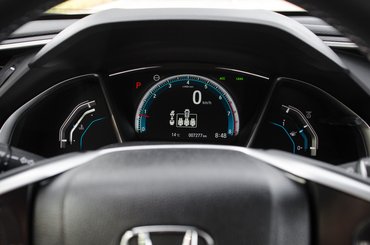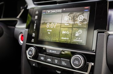 Az előző Civic kétlépcsős, kaotikus műszerfala után mondhatni, rend van. A középkonzolon nem találtak fel semmi őrületest, inkább kihozták megúszósra ezzel a középméretű kijelzővel és az alap fizikai gombokkal. A menü grafikája nem a legszebb, de az alsó-középkategóriában valahogy senkinél sem az, míg maga a menü holt egyszerű, egy teszthét alatt meg lehet szokni az olyan furcsaságokat is, mint a csak fizikai gombra nyíló klímaszabályzás, amit aztán csak a fizikai és az érintős gombokat együtt nyomkodva lehet használni. Egyedül az alvó állapotban digitálisan vetített kvarcórát nehéz megérteni, de ez talán pont olyan ízlésügyi vadhajtás, amit nem Kárpát-medencéből fogunk megfejteni. A műszeregység már nem annyira tucat. A Hondánál egyelőre nem jött el a full digitális korszak, de a középső kijelző a kormány mögött azért már pixelekkel dolgozik.