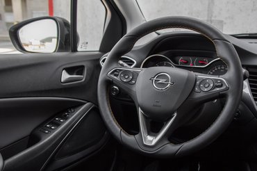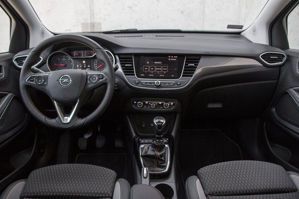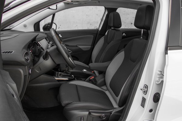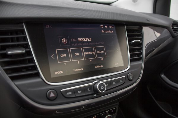 Odabent mindenesetre olcsóbb benyomást kelt a Crossland, mind a kidolgozottságot, mind az anyaghasználatot illetően, közben mégsem fáj senkinek. Mert azok a felületek, amikkel érintkezünk, rendben vannak – legalábbis ezen a felszereltségi szinten. Bőr a kormány, a puha (leszámítva a szélvédő tövét, de azt meg ki látja?) műszerfalon fémes hatású, de műanyag betét szürkéllik, az ajtókon a jókora kemény műanyag felületet műbőr enyhíti. A kezelőszervek opelesek, a francia rokonság csak apróságokon vehető észre – ilyen az ablakemelő és a tükörállító gombja. Kapunk szemmagasságú kijelzőként említett HUD-pótlékot is, ami felnyílik-lecsukódik, mutat sebességet, navigációt, táblákat, hasznos extra 80 ezerért.