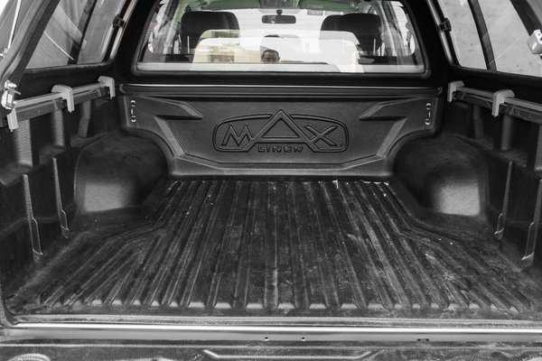 A platót műanyag platóbélés védte a behatásoktól. Ezt, az autó árához képest filléres kiegészítőt (bruttó 76 ezer forint) minden pickupra megrendelném, nagyban növeli a tulaj nyugalmát pakoláskor, szállításkor. Ez a perem nélküli kivitel volt, így itt a négy sarokba, kb háromnegyed magasságban elhelyezett fülhöz lehetett kötözni az elszaladó dolgokat.