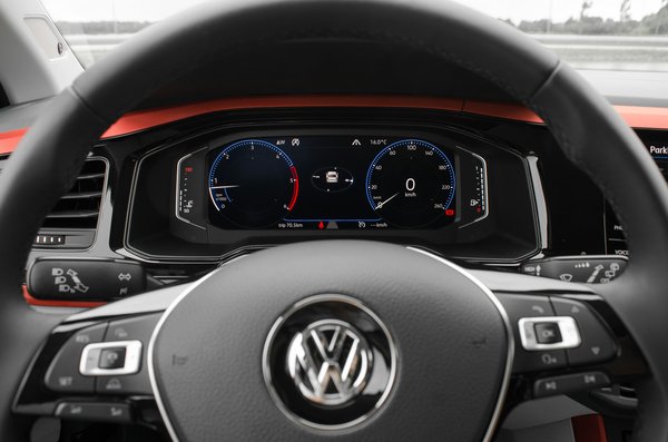 Van még enyhén a vezető felé hajló középkonzol, ami mostanság szintén egész menő megoldás. Az elektromos rögzítőféknek még kell pár év, hogy leszivárogjon a szegmensbe, szóval a kézifékkar maradt, de az előretolható könyöklővel jól el lehet rejteni. Őrület, de még full digitális műszeregység is van az új Polóban. Annyira nem rohanunk azért, hogy az alap Trendline felszereltségbe is ezt rakják, de attól felfelé már a beltér része. 11,3 colos, azaz kisebb, mint a Golfé, de mivel ebben a magasságban vizuálisan minden egybeolvadt ezzel a lakk feketével, a központi kijelző túlfeléig, ez sem tűnik aprónak.