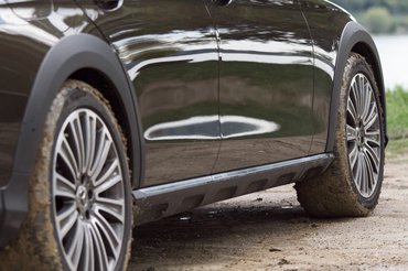 A kerekek a legmegdöbbentőbbek, hiszen a méret még nem olyan szokatlan. 19-es felniket már Opel Adamra is kérhetünk, de ezen nem peres, hanem ballonos gumik vannak, ami elég jól néz ki. Maga a műanyagozás egy fokkal radikálisabb, mint a V90-es Volvón, de talán egy fokkal szívesebben karistolom össze, mint a fényezett elemet. És van az az optikai hatás, amit nem lehet műanyagokkal elérni, ez pedig a magasság: az All Terrain 29 milliméterrel ül magasabban, mint egy hagyományos E kombi, ebből 14 milliméter a kerékátmérő növelésével, 15 a futóművel jött össze. Ennek neve Air Body Control, és nem összekeverendő az S osztály kamerás kátyú-letapogatójval; légrugós futómű, amely terepezés esetén még 3 centivel megemelhető, de csak 35 km/órás tempóig.