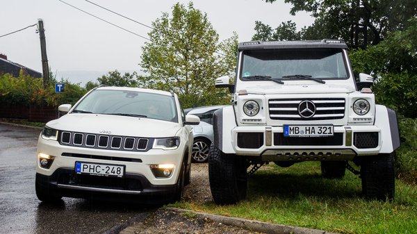A budai hegyekben űzzük a Compasst, éppen a Család és a Karrier állomás között. És akkor belehajtottunk nagyobbacska benzinkútba, legalábbis a méretei és a lámpák miatt úgy nézett ki. A Mercedes G osztály önmagában is elég ütős látvány, de ez egy 4x4², vagyis azt a változat, ami alatt portáltengelyek vannak, 20 colnál is bőven nagyobb kerekekkel. Mellé tettük szerencsétlen Compasst, olyan volt, mint egy tacskó a bullterrier mellett. Mivel a világon nincs olyan terep, ahová ez a G Merci indokolható lenne, valahogy most jobban kívánom a Jeepet.