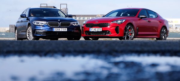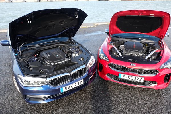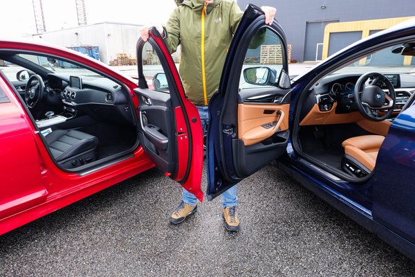 Nem fogom körbeajnározni, hiszen Csikós már megtette jó pár hete az európai bemutatón. Szerencsére Tannisba hoztak egy 5-ös BMW-t is, ami egy méretosztály a Kiával, ugyanúgy összkerekes, amely inkább a hátul kaparós karakter felé tolódik, ugyanúgy sulykolja a vezetési élményt. Ráadásul a Kia épp csak elkezdett tapogatózni a műfajban, a BMW viszont évtizedek óta ezzel határozza meg a márkaimidzset, épp ezért nagyon adja magát, hogy összenézzük a két autót. Viszont a szerencsénk véges, hiszen a BMW nem egy motorméretben és teljesítményben passzoló 540i, hanem egy dízel 530d, ráadásul kombi, míg a Kia amolyan ötajtós kupé. Van viszont még egy ordas különbség: a Kia nem prémium autó, a BMW viszont az, és amíg nem tudunk egy rendes, turbós sorhatost tenni a Kia V6-os biturbója mellé, addig legalább a belteret összekóstolhatjuk.