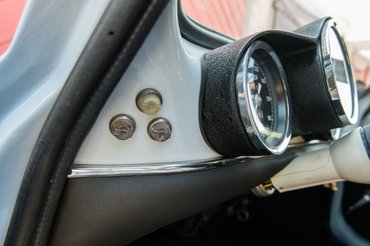 Nem, nem kell neki por az aszfaltra, erőből megfordul a tiszta bitumenen is, még a fél gáz is sok hozzá. Valamit tudnak a Scuderia Topolino-féle, Németországból vett, módosított első tengelycsonk-állványok is, mert a gyári állapotában teljesen halott, 600-as-féle kormány itt sokkal élettelibb. Például meg lehet vele fogni a kitörni készülő kocsit, a 600-assal halott lennék. Az persze nem is akarna megölni, de ez más kérdés.