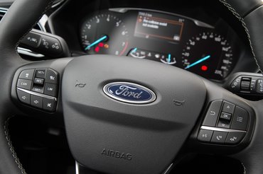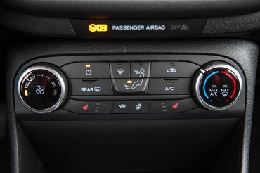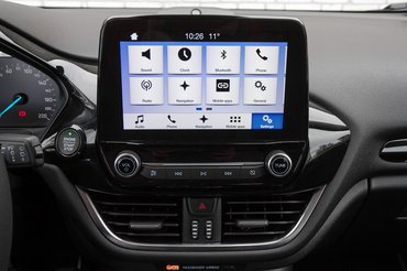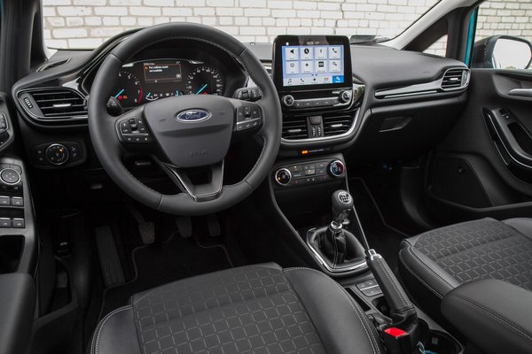 Rég esedékes volt már a Fiesta műszerfalának modernizálása, és a legújabb verzió nem okoz csalódást. Úgy lett áttekinthetőbb és letisztultabb a vonalvezetése, hogy frisseségét nem veszítette el. Még úgy is kellemes a szemnek, hogy anyagválasztásban a Fordon is érezhető a spórolás. Messze nem annyira, mint a Suzukin, de még a Kiánál is visszafogottabban; néhány műanyag a Fiestában is kopogós. Harmonikus az arány a fizikai gombok és kapcsolók, illetve a központi érintőképernyős (felszereltségtől függően 6,5 vagy 8 collos) kijelzőn át elérhető funkciók között. A Ford Sync infotaiment rendszerének 3. generációjában már nagyobbak az ikonok és logikusabb felépítésű a menürendszer, így sokkal jobban használható.