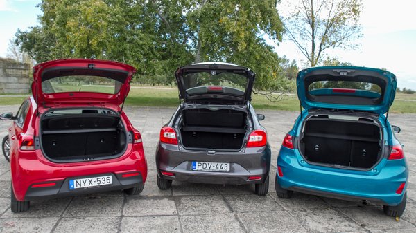 Ebben a mezőnyben a Fiesta csomagtartója is a legkisebb, mindössze 303 literes, ráadásul elég magas a pereme, amit feláras, dupla csomagtérfedél igyekszik kompenzálni. Rendeléskor nem érdemes kihagyni, mivel nélküle a hátsó ülések ledöntésekor sem kapunk sík, egybefüggő padlójú rakteret.