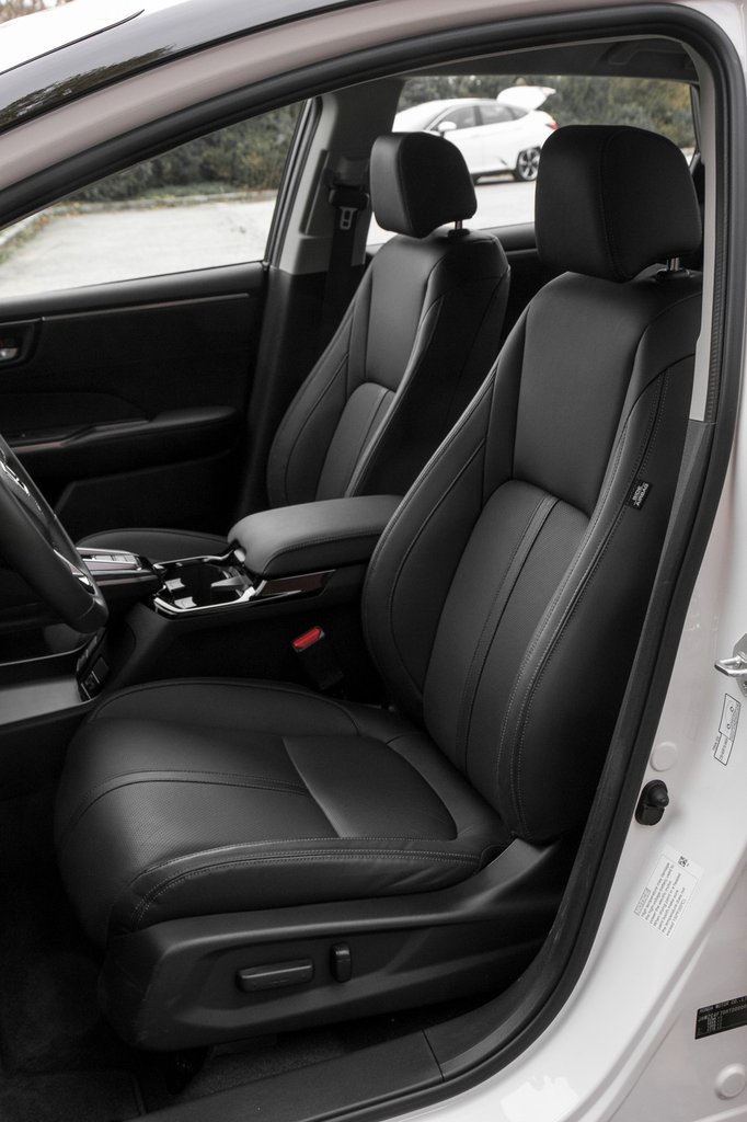 Érdekes, hogy a fogalmatlan külső ellenére a Clarity belseje mennyire jó. Egyrészt tágas, a formák emészthetőek, az anyagok meg szépek. Ugyanakkor minden reciklált anyag, és könnyű – a csodálatos, kitapintható erezetű fáról például hamar kiderült, hogy csak matrica, a hasított bőr is valami újrahasznosított anyag – és így tovább. Viszonylag könnyű megtanulni a műszeregység használatát, szokás szerint több info váltogatható, ha a kormányon lévő gombokat nyomkodja az ember.