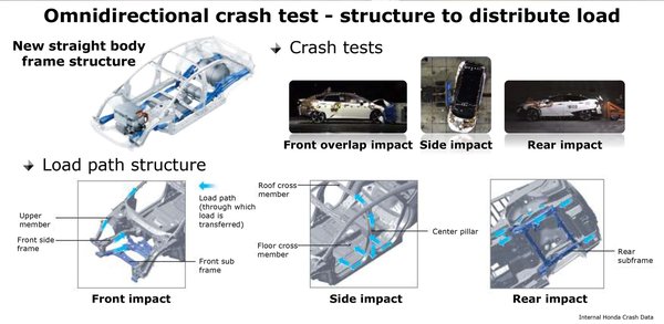 Az autó maga mégis hatalmas lett, mivel az utastere hihetetlenül tágas, de még csomagtartója is van, noha a gáztartályok eszméletlen sok helyet rabolnak. Így aztán a végeredmény egy 1,9 tonnás, 4,9 méter hosszú autó, vagyis nagyjából akkora, mint egy új 5-ös BMW. Más kérdés, hogy a csomagtartóban van egy hatalmas lépcső, a hátralátást pedig úgy oldották meg, hogy egy kis ablakot vágtak a két hátsó ülőhely közé a támlába, amin át a hátsó, függőleges üvegen is ki lehet kukucskálni. Már ha nincs tele a csomagtartó. Még egy meglepetés, hogy a csapott hát ellenére a Honda négyajtós, vagyis pici a csomagtérfedele, de a csomagtartóban lévő lépcső miatt amúgy sincs esély nagy tárgyak bepakolására.