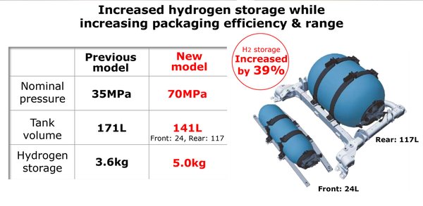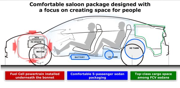 A Honda egy 117 literes nagyobb tartályt tett a hátsó ülések támlái mögé, és egy 24 litereset a hátsó ülések alá. Hogy az elöl utazóknak is legyen miért idegeskedniük, ők meg az akkukon ülnek. Ám örülhetnek, mert az FCX Clarityben még a tüzelőanyagcella ott volt a két első ülés közötti könyöklőben, ezt az új járműben már elöl, a motortérben helyezték el.