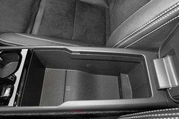 Persze olcsóbb a kivitel, mint a nagyobb modellekben: ha eleget bököd az ujj, előbb-utóbb talál eldugott, kemény műanyagokat, a dinamikaválasztó gomb sem a szokásos, rönkforgatós, gyémántmintás cucc a középkonzolon, hanem csak egy nyomógomb a műszerfalon, indítani is egyszerű nyomógombbal kell a motort, nem pedig elfordítós, szintén gyémántmintázatú fémgombbal. Viszont a váltó előválasztó karja ebben is varrott bőr, masszív alapokkal, s itt is meglesz majd az Orrefors kristálymarkolat, ha végre megjön az Inscription-szintű kivitel.