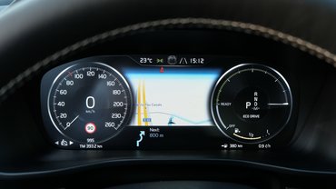 A Volvo-féle, hatalmas táblagépes infotaiment-vezérlés, a Sensus is kisebb itt, csupán nyolccolos az alapkivitelben, s valamivel kevesebb menüpont is lakik benne. Nem a Bowers & Wilkinstől származik már a csúcshifi, hanem a Harman Kardontól, ami mögött nem érzek minőségváltást bármilyen irányban. Talán az volt a csere oka, hogy a B&W zárt ládákban jó, viszont a mélyhangszórók ajtókból való kiköltöztetése miatt nyitott hátuljú (open-baffle, vagy ahogy a Volvo hívja: Air Woofer Technology) nyomókra volt szükség, amilyenek kialakítására csak az HK volt hajlandó. Mindenesetre a Harman Kardon is jól szól – olyan egyébként nagyon rég volt, hogy bármilyen nem-alap Volvóba rosszul hangzó hifit tettek volna.